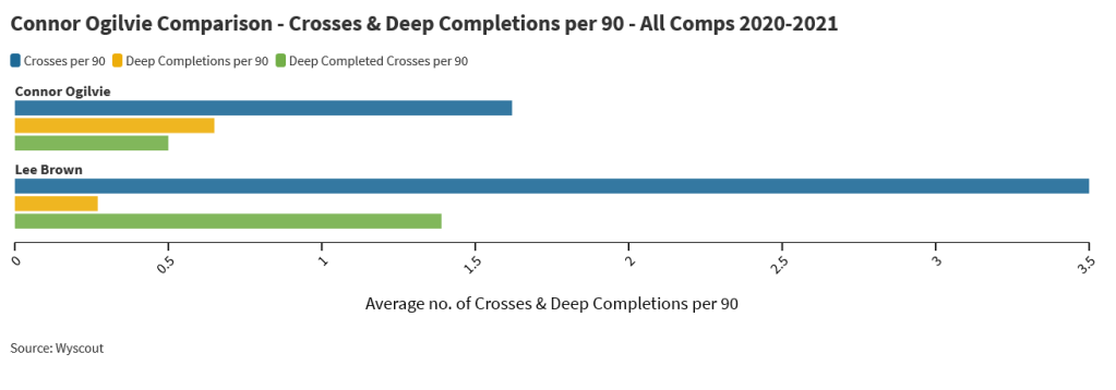 Ogilvie is average when compared to other League One fullbacks for deep completed passes per 90 at 0.65. His low number of deep completed crosses is down to how little he crosses the ball in general.