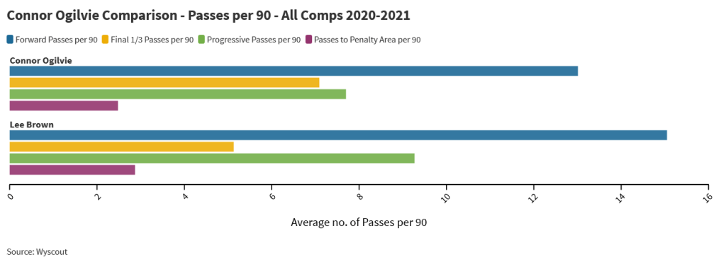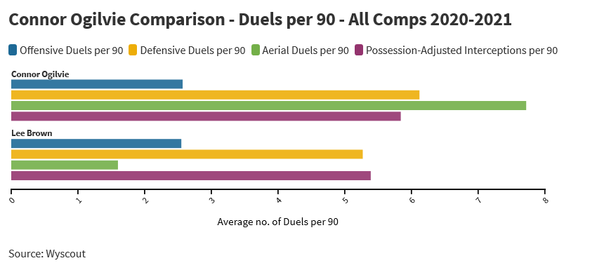 Brown has been criticised for his mobility, and Ogilvie seems even more defensive when looking at certain stats. He also rarely dribbles, averaging only 1.01 per 90.
