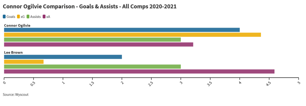 Compared to Lee Brown, Ogilvie gets himself into higher quality scoring positions, understandable given that he’s six foot tall and was often tasked to create chances from set-pieces.
