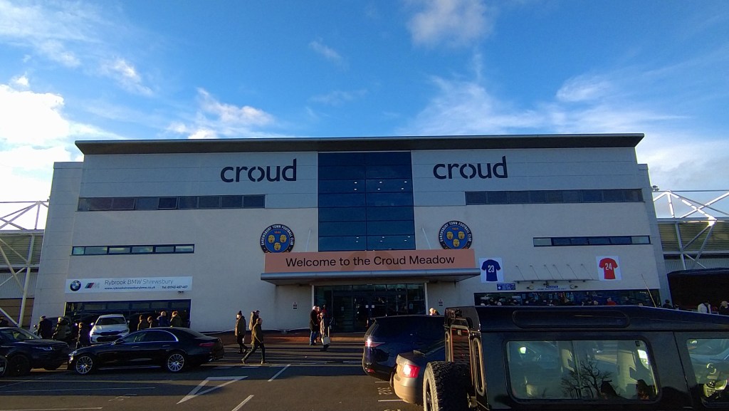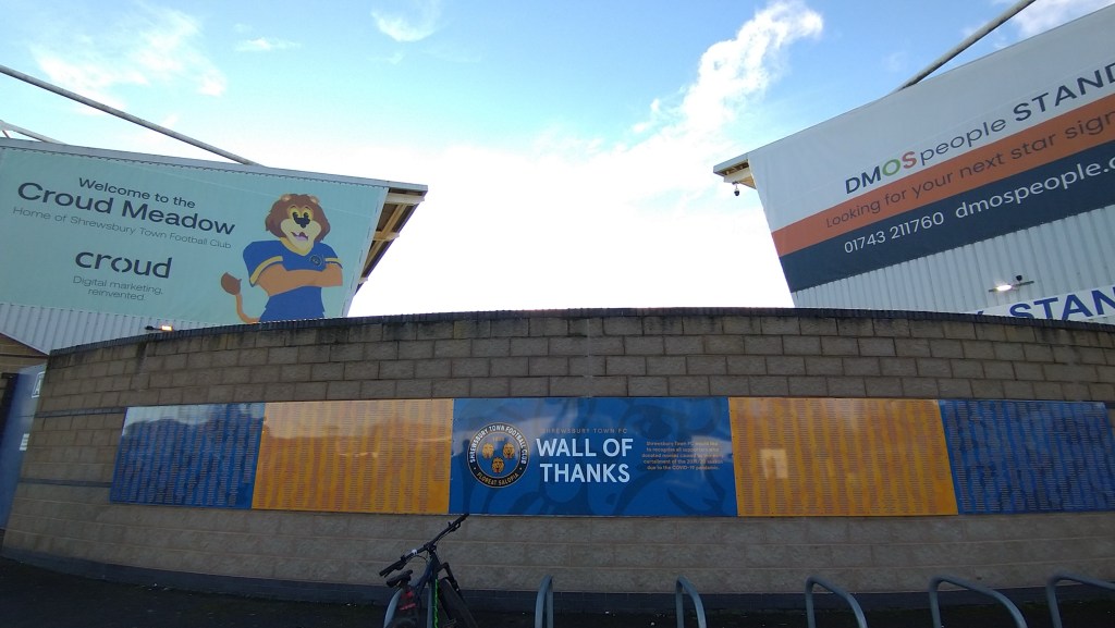 In the South and West stands, there is an impressive collection of Shrewsbury banners with slogans such as Breathe On ‘Em Salop, Floreat Salopia (Shropshire’s county motto) and the Spirit of 79.